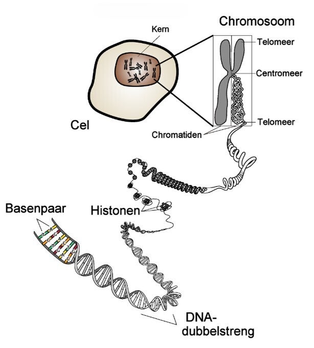 Ons genetisch materiaal (DNA) ligt opgeslagen in chromosomen in de kernen van onze cellen. DNA is opgebouwd uit twee lange, met elkaar vervlochten strengen van zogeheten nucleotiden. Die bestaan uit fosfaat, desoxyribose (een suikersoort) en een base. Van die basen kennen we vier verschillende: cytosine, guanine, thymine en adenine. Ze worden afgekort met de letters C, G, T en A. De volgorde van die vier letters van al het DNA in een menselijke cel wordt het genoom genoemd. Dit genoom bestaat uit iets meer dan zes miljard afzonderlijke DNA-letters, verspreid over 23 paar chromosomen.