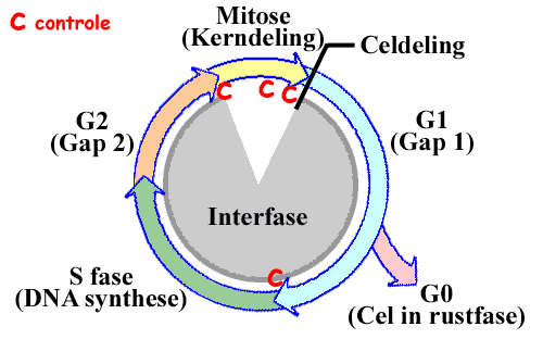 Er zijn checkpoints in de interfase (vooral aan het einde van G1 en G2) die de celtoestand controleren en zorgen dat de cel alleen verder deelt als alles in orde is.