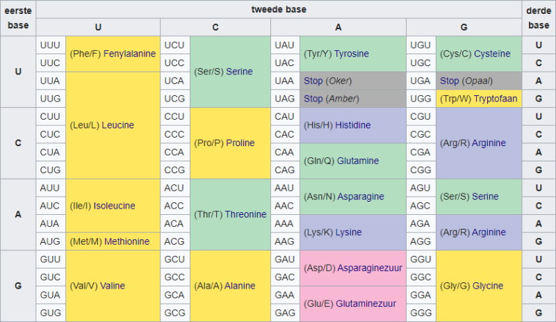 Alle organismen op aarde delen dezelfde 20 aminozuren. Bovenstaande codontabel laat zien hoe de genetische code van levende organismen wordt vertaald naar deze aminozuren. Deze tabel toont hoe codons, dit zijn tripletten van nucleobasen, coderen voor specifieke aminozuren. Ter verduidelijking: een codon is samengesteld uit drie nucleotiden, aangeduid met de nucleobasen Adenine, Guanine, Cytosine, Thymine en Uracil. Er zijn in totaal 64 codons en slechts 20 aminozuren, hierdoor coderen meerdere codons voor hetzelfde aminozuur.