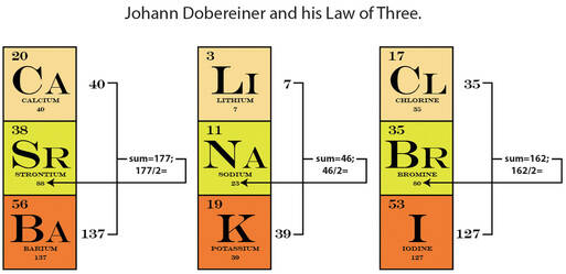 In 1829 herkende Johann Döbereiner triaden van 3 elementen met chemisch vergelijkbare eigenschappen. Hij probeerde aan te tonen dat in elke triade het gemiddelde van de lichtste en zwaarste atoomgewichten het atoomgewicht van het middelste element benaderde. Maar hij kon slechts enkele triaden onderscheiden, en bleek niet in staat om ‘drieklanken’ te maken van alle bekende elementen…………Pas toen in 1860 een nauwkeuriger lijst van de atoommassa van de elementen beschikbaar kwam, werd er enige vooruitgang geboekt in de richting van de ontdekking van het moderne periodiek systeem.