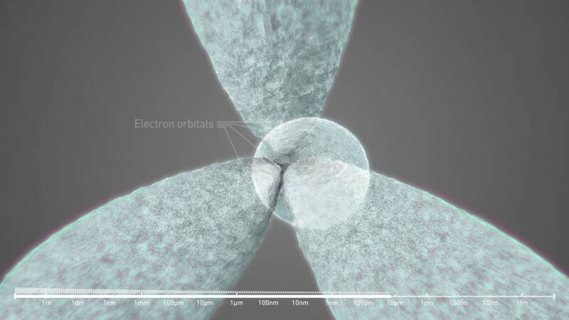 Je zou je kunnen afvragen hoe snel elektronen door atomen bewegen. Een duidelijk voorbeeld, en het gemakkelijkst te berekenen, is het waterstofatoom dat in al ons water voorkomt. Uit berekeningen blijkt dat het elektron zich met een snelheid van ongeveer 2.200 kilometer per seconde verplaatst, wat minder is dan 1% van de lichtsnelheid. Dan krijg je een idee van de waarschijnlijkheid om een elektron ergens aan te treffen..........
