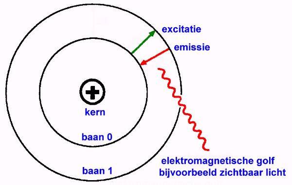 Elektronen kunnen van een lager naar het volgende hogere energieniveau springen als ze deze hoeveelheid energie absorberen. Omgekeerd, als elektronen van een hoger naar een lager energieniveau springen, geven ze energie af: zo ontstaat licht.