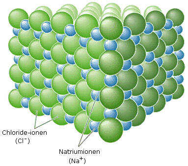 Het bestaat uit positief geladen natriumionen Na+ en negatief geladen chloride-ionen Cl-