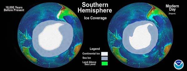 Antarctica, dat 95 procent van al het ijs op Aarde bevat, verliest voornamelijk ijs aan de randen door afkalving. De westelijke ijskap verliest significant ijs, terwijl er weinig bewijs is voor ijsverlies in oostelijk Antarctica. Twee scenario's zijn opgesteld voor de zeespiegelstijging door het Antarctische ijsverlies in 2100, variërend van een daling van 1 centimeter tot een stijging van 49 centimeter.