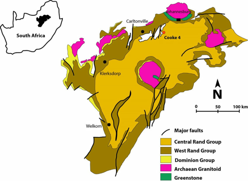 Het Witwatersrand-Bassin werd gevormd als “reactie” op een reeks bewegingen van aardkorstplaten, de eerste tektonische bewegingen! Tektonische omkering na de uitvloeiing van 2,9 Ga andesitisch (mineralen bevattend) lava leidde tot een verschuiving naar continentale sedimentatie. Deze fase ging gepaard met de grootste bekende goudconcentratie in de geschiedenis van de Aarde, aanvankelijk door microbiële hechting aan opkomende kolonies van waarschijnlijk cyanobacteriën in omgevingen nabij de kustlijn, vervolgens door mechanische bewerking van de goudrijke microbiële matten om door conglomeraten geleverde ‘placerafzettingen’ te vormen.