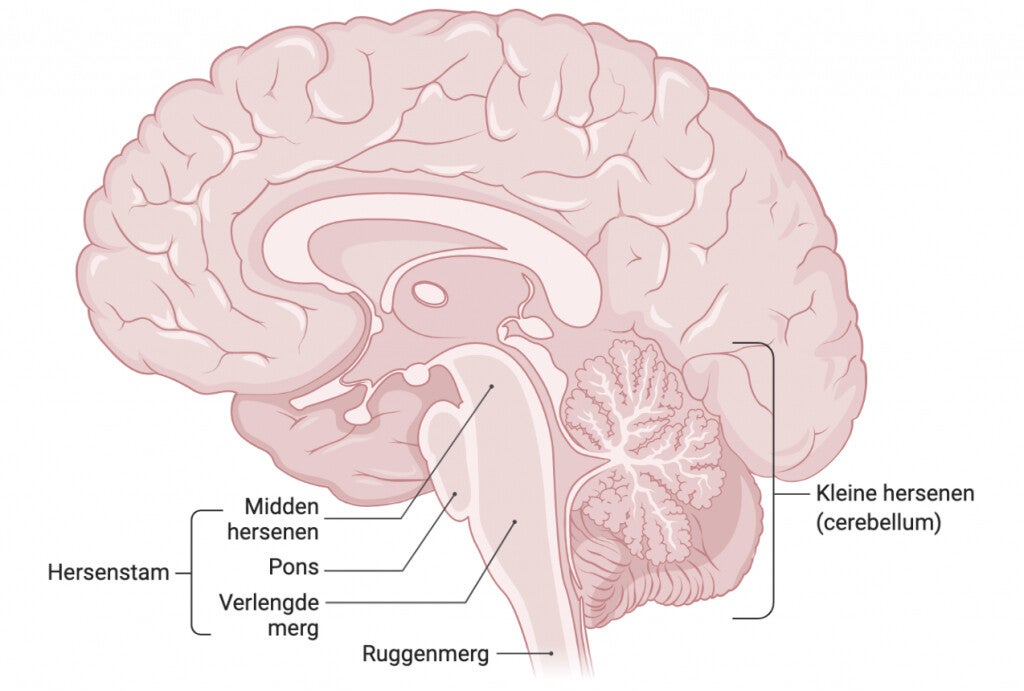 Wat op de afbeelding niet in detail is weergegeven zijn de eerder genoemde hersenzenuwen die signalen doorsturen vanuit de hersenstam: