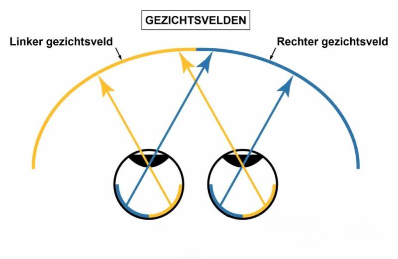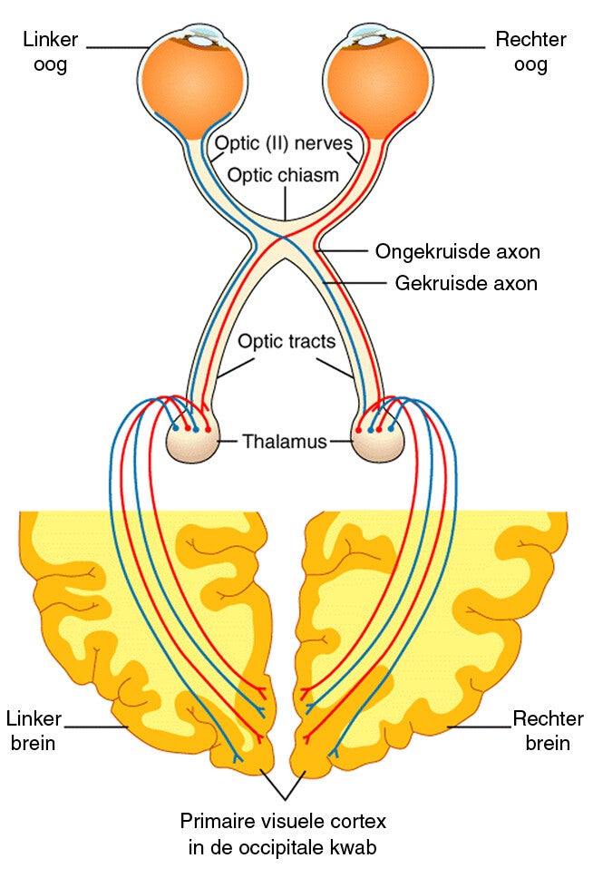 Visuele informatie van het rechter gezichtsveld (van beide ogen) gaat naar de linkerhersenhelft en die van het linker gezichtsveld naar de rechterhersenhelft, na kruising bij het chiasma opticum.