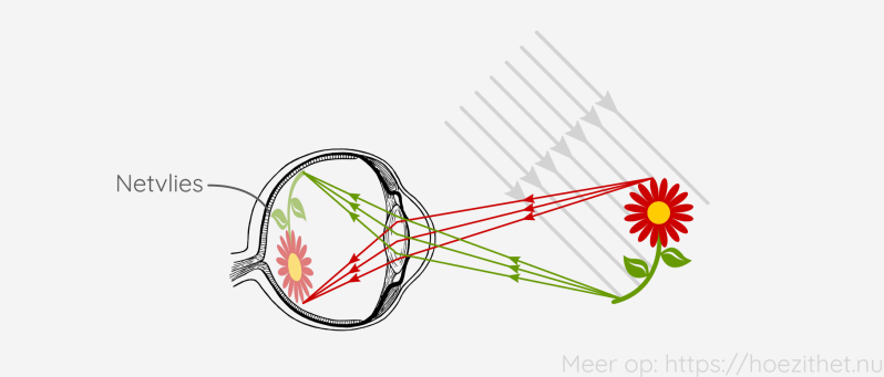 Alles wat je ziet, is eigenlijk het resultaat van lichtstralen die je ogen binnenkomen. Via het netvlies, staafjes en kegeltjes worden deze stralen omgezet in elektrische signalen, die via de oogzenuw naar je hersenen gaan. Daar worden ze verwerkt tot een beeld, waarbij ook context zoals herinneringen en andere zintuigen een rol speelt. Het is dus echt een samenwerking tussen oog en brein.