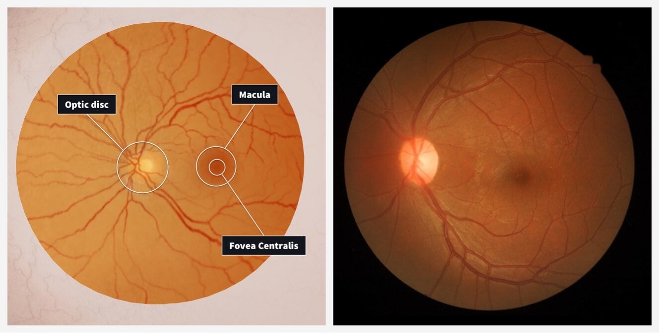 De gele vlek (macula) in het centrum van het netvlies waar de meeste kegeltjes (kleur- en detailzicht) zitten, is essentieel om scherp te kunnen zien.