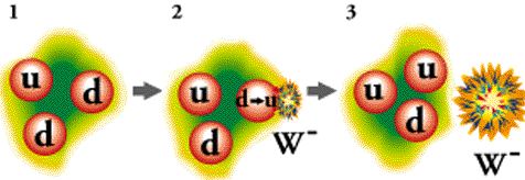 Bij dit verval verandert een neutron in een proton en zendt een elektron uit en een elektron-antineutrino door β- straling, óf een proton verandert in een neutron en zendt een positron en een elektron-neutrino uit door β+ straling. Het elektron-antineutrino symbool ̅νe is het antideeltje van het elektron-neutrino νe