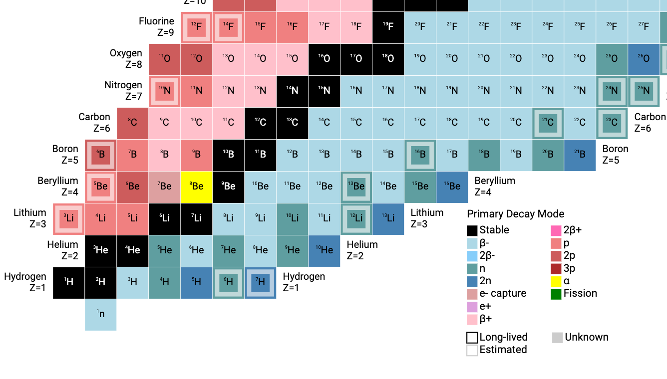 In een eerdere Verdieping heb ik uitgelegd hoe elementen zijn ontstaan. Nu wil ik ingaan op de elementen en hun isotopen die belangrijk zijn voor het ontstaan van leven, en informatie geven over de verschillende isotopen van die elementen, zoals hun stabiliteit (stabiel of instabiel), verval en halfwaardetijd. De lichtste elementen en hun isotopen worden in sterren gevormd, de zwaardere elementen tijdens een supernova-explosie. Elementen worden 'zwaar' genoemd omdat ze een groot aantal kerndeeltjes hebben (hoog massagetal), wat mede komt door een overschot aan neutronen ten opzichte van protonen.